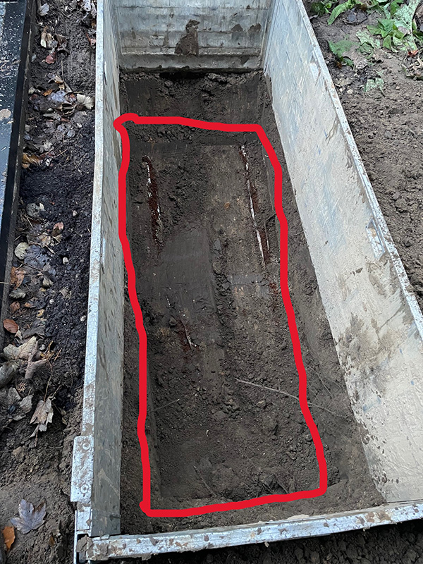 Het graf wordt geopend tot aan de aftekening contouren van de kist.